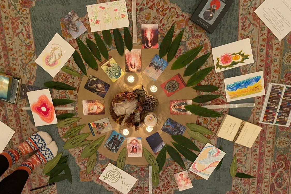 We sit in sacred circle on cushions, blankets, or chairs around a central altar. Each circle, one or more of our facilitators brings a theme, topic, and curated set of explorations and exercises then intuitively guides the group through them. Some circles may be deep, some may be playful, or all of the above. We may: